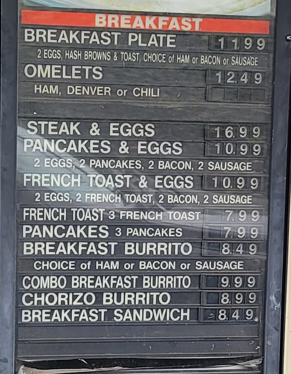 This menu accommodates quick orders and casual dining scenarios, suitable for customers looking for fast, filling American-style meals throughout the day, including breakfast and lunch periods.