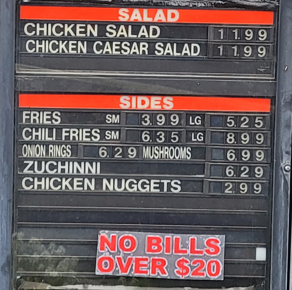 Sides: Complementing the main dishes are traditional fast food sides such as French fries, chili fries, onion rings, and zucchini sticks. The menu also includes chicken-based sides like chicken strips and chicken nuggets, as well as specialty items such as mushrooms prepared for a fast food setting.